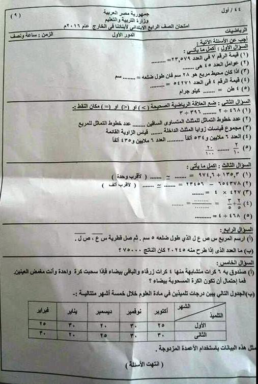 امتحان الرياضيات للصف الرابع الابتدائى آخر العام أبناؤنا فى الخارج 2016 Omniawagdy
